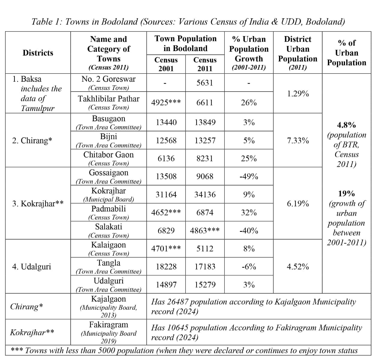 According to the 2011 Census, the population of Bodoland stood at 3.2 million, with approximately 4.8% residing in 12 towns of which six are statutory and six census towns. There is no much data on the urban population of Bodoland. But an overall decadal urban population growth between 2001 and 2011 census was 19 per cent. Of late Bodoland, which was once characterized by slow urban growth due to various reasons such as neglect, infrastructural decencies and conflicts, is now beginning to see a rapid growth and expansion of urban areas. Urbanisation in Bodoland areas seem to have spurted especially after the peace accord of 2003. And recently two more areas, namely Kajalgaon in 2013 and Fakiragram in 2019 have been declared as towns, making the figure of towns in Bodoland as 14 in number (see Table 1).