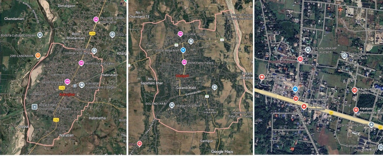 Figure 1: Maps of Kokrajhar, Udalguri & Kajalgaon Towns (Sourced from Google Map on 30 Sep. 2025. Maps not to scale)
